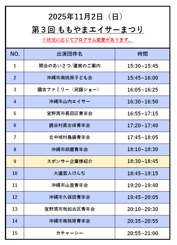 本日は第3回ももやまエイサーまつりにご来場いただきまして、誠にありがとうございます。南桃原青年会精一杯演舞させて頂きますので応援の程よろしくお願い致します。